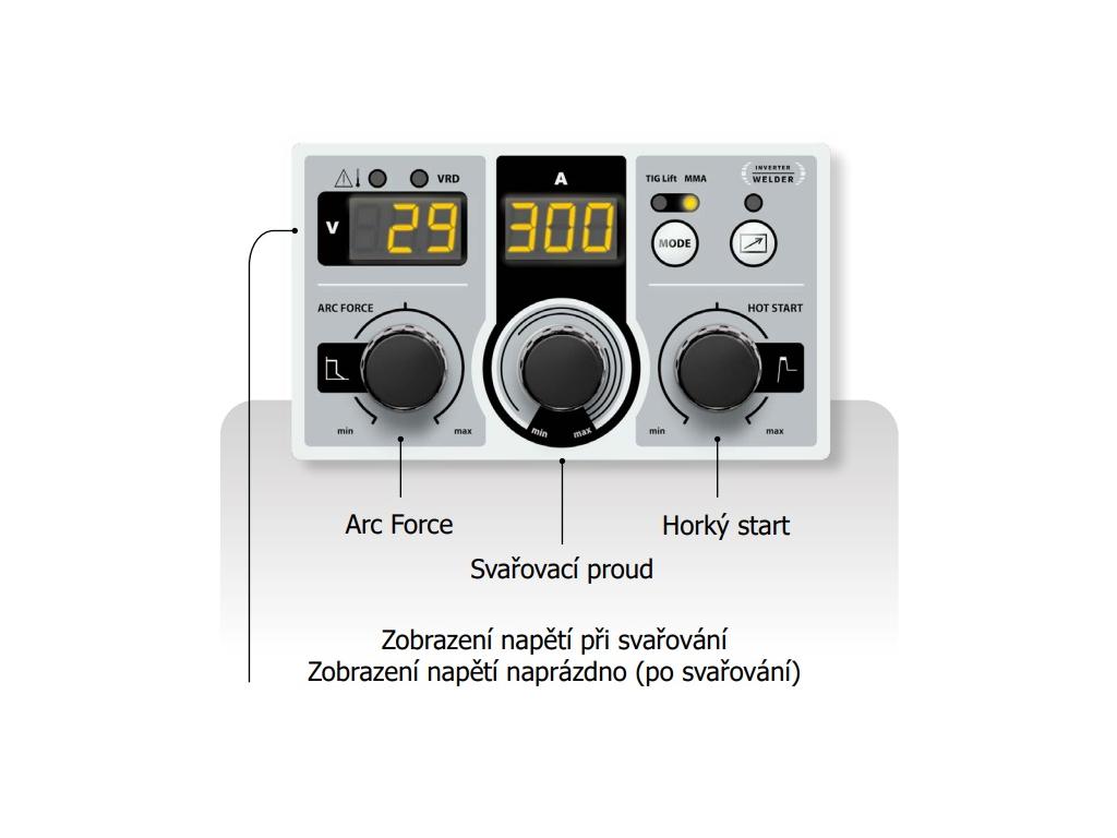 - VRD (Voltage Reduction Device) lze aktivovat pomocí vnitřního spínače, který z bezpečnostních důvodů snižuje napětí naprázdno až na 20 V.