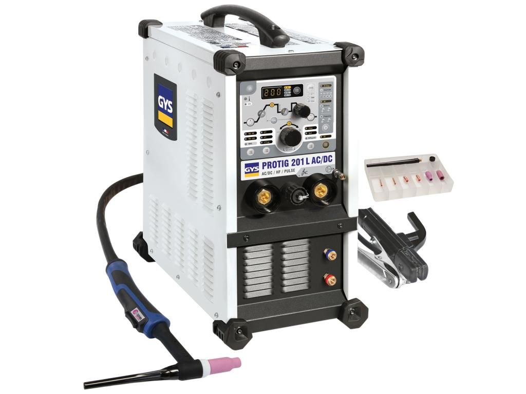 Výkonná TIG svářečka GYS PROTIG 201L AC/DC HF s vodním chlazením pro svařování TIG a MMA (elektrody do průměru 4 mm). S pulzním režimem. 50 paměťových míst pro uložení svařovacích programů. Funkce PFC, FV, VRD a aj.