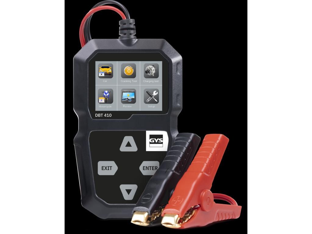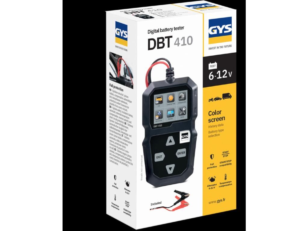 Tester autobaterií DBT 410 s digitálním podsvíceným displejem a jednoduchým ovládáním pro baterie 6V až 24V. Ze sady testerů autobaterií od francouzské společnosti GYS.