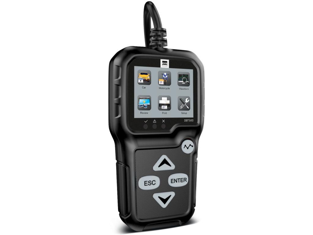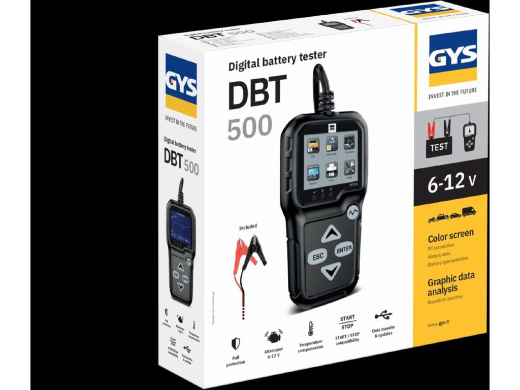 Tester autobaterií DBT 500 s digitálním displejem a jednoduchým ovládáním pro baterie 6V a 12V. Ze sady testerů autobaterií od francouzské společnosti GYS.